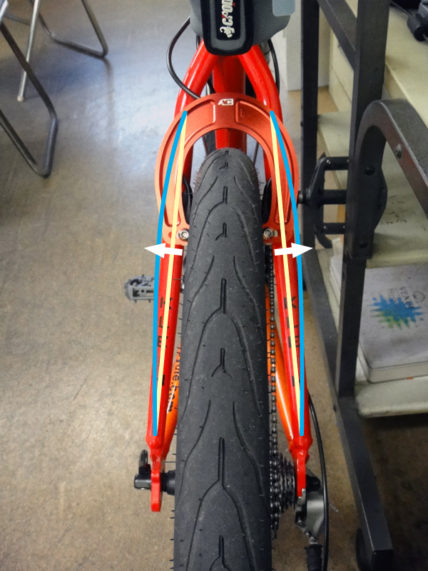 ブレーキを交換して調整中に気が付いたんだけど、リアブレーキをかけるとフレームが歪んでるのに気が付きました。